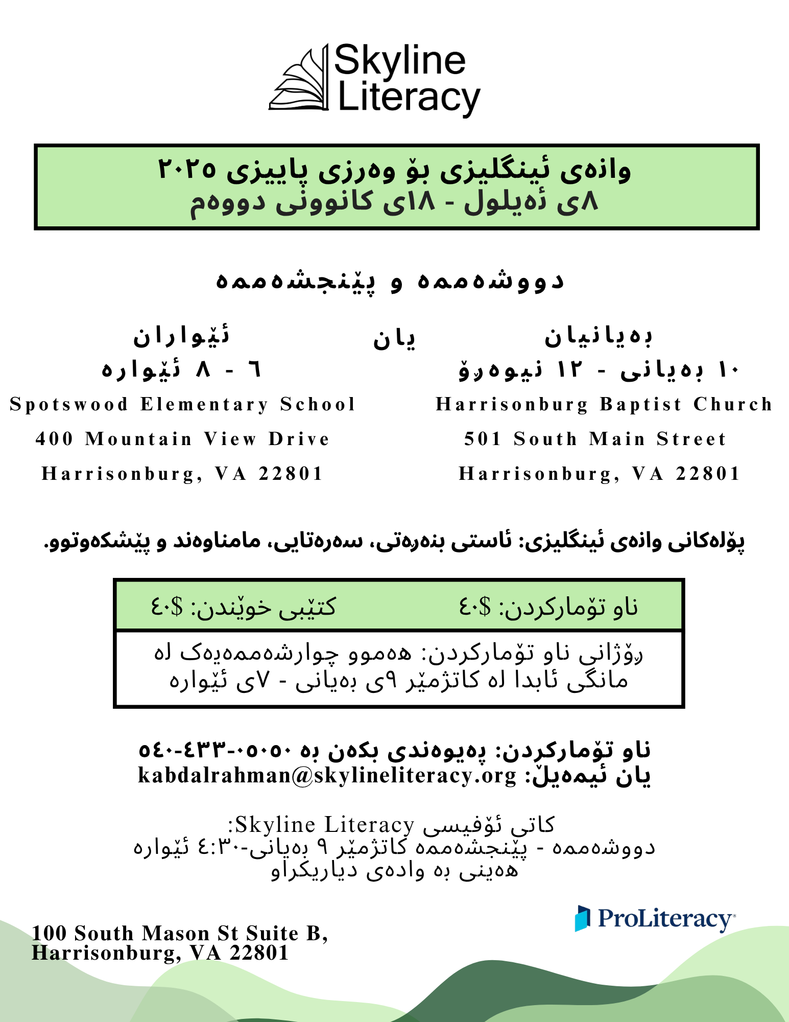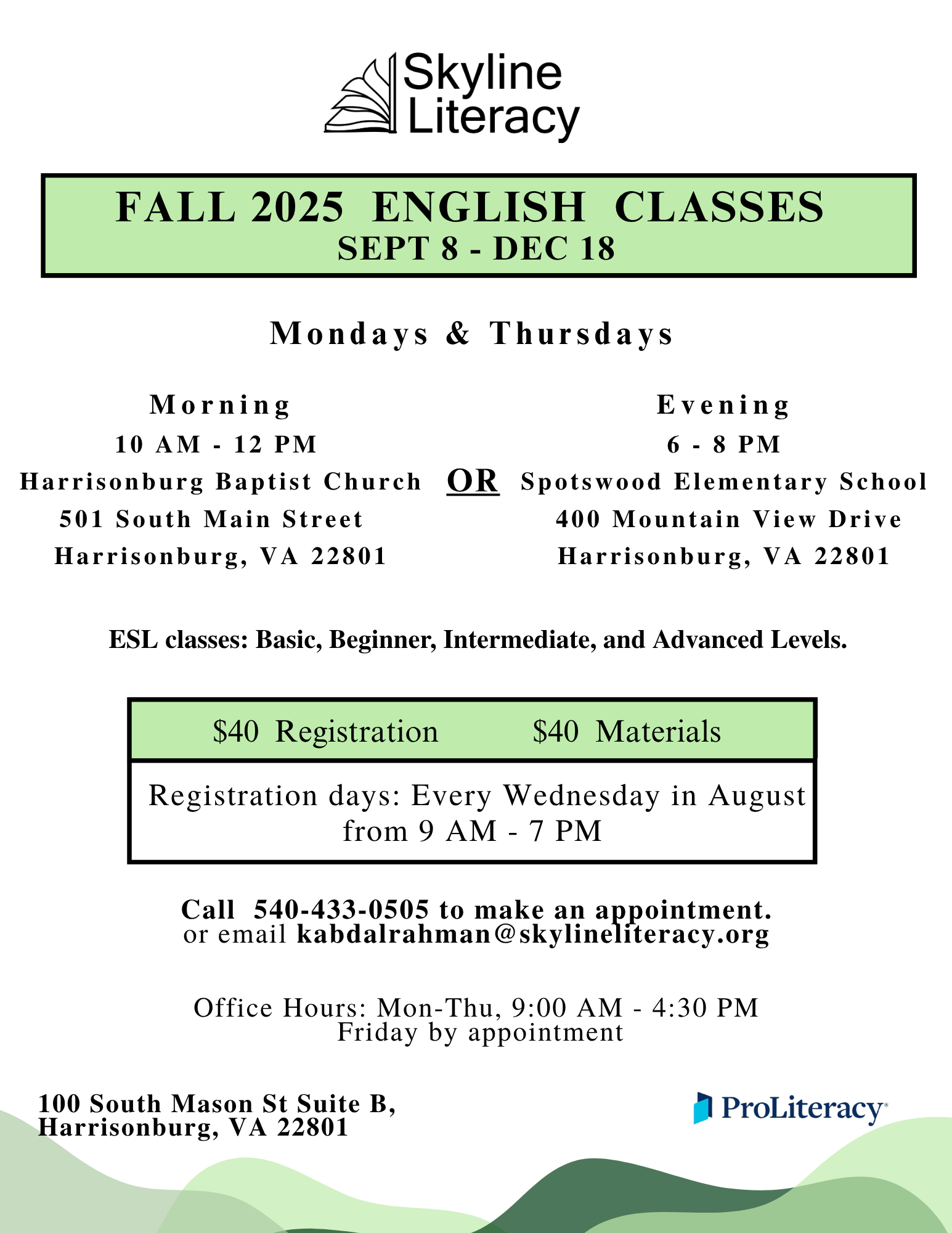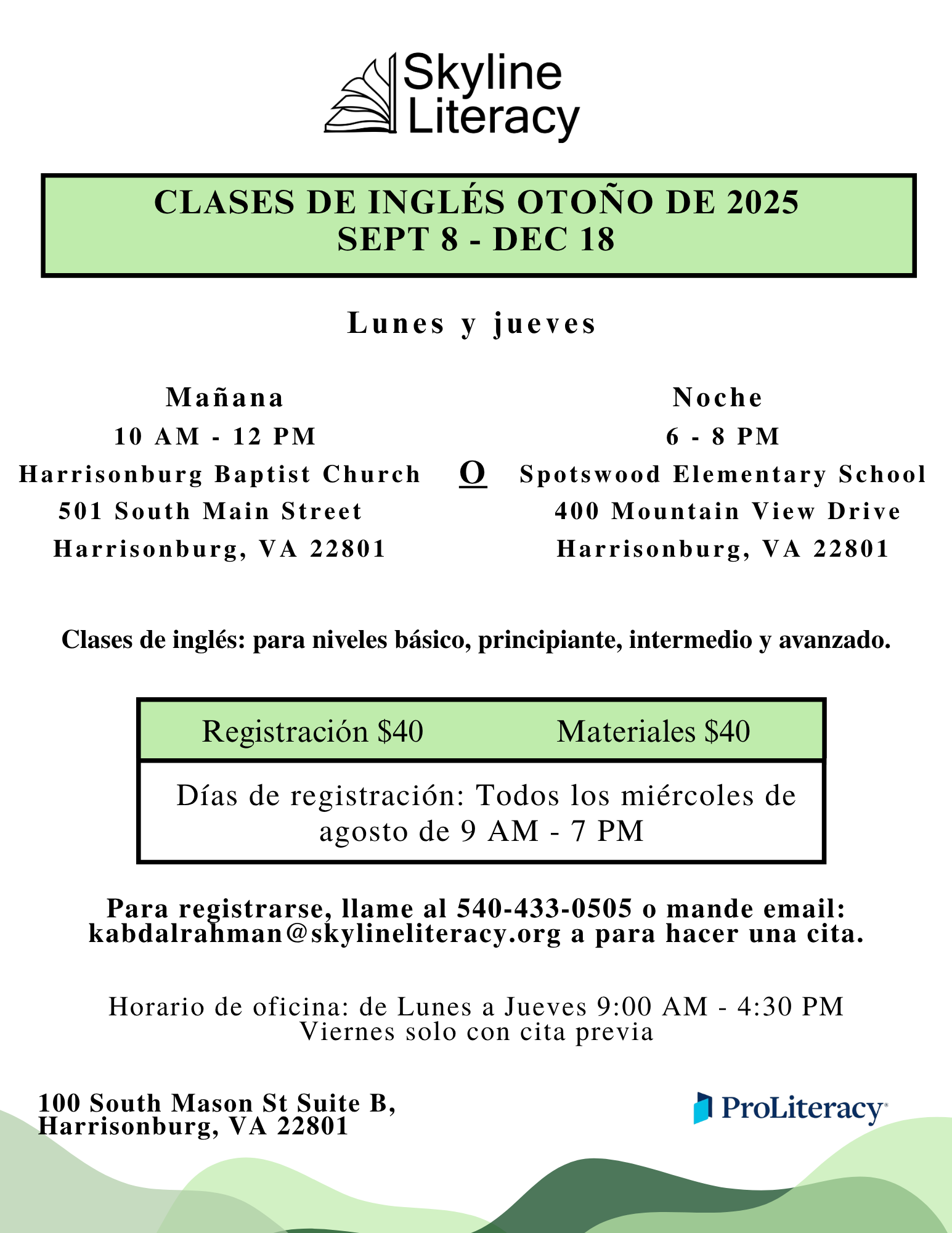 Please CALL Skyline Literacy at (540) 433-0505 or email info@skylineliteracy.org