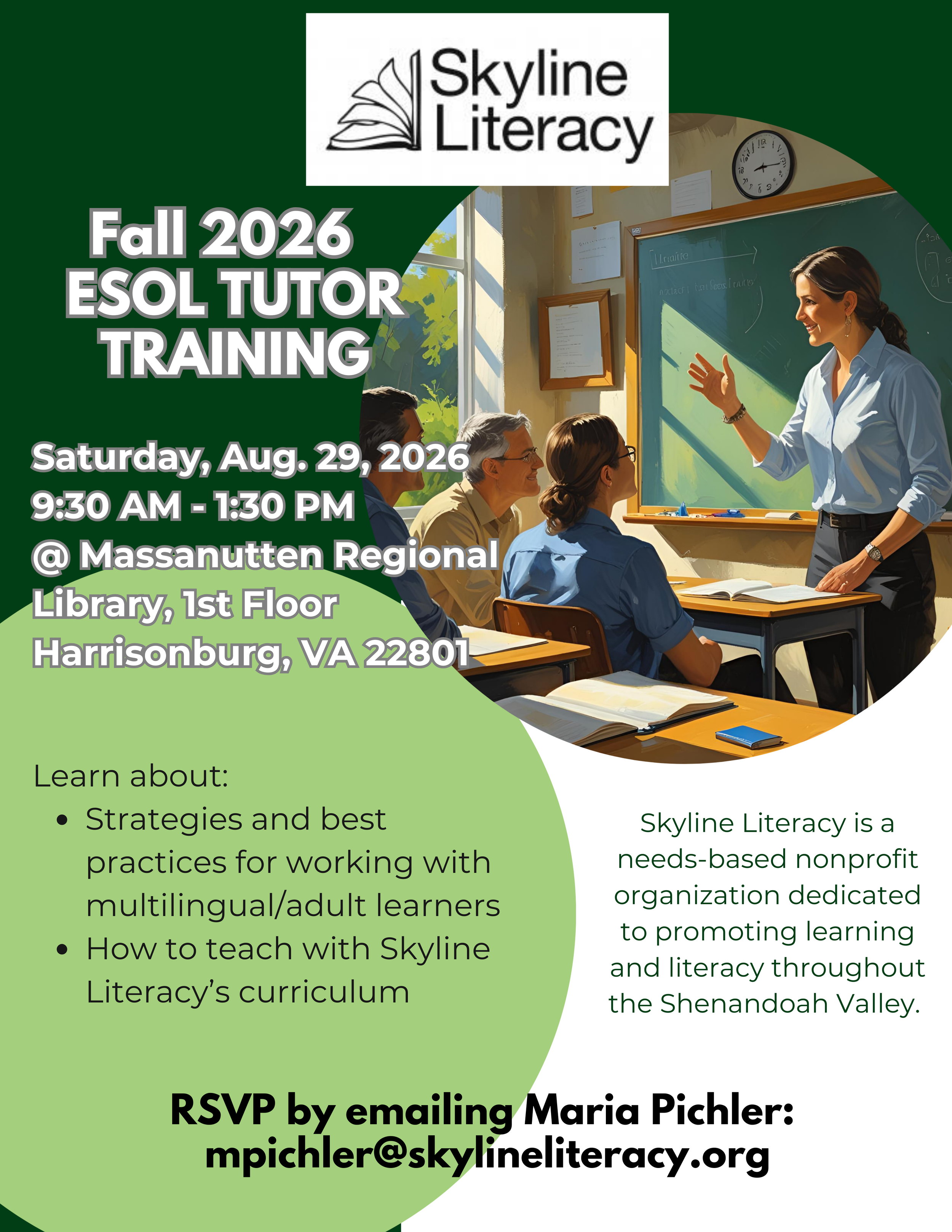 Our success depends on people like you to serve as volunteers for our literacy services. If you are interested in helping adult learners improve literacy skills in order to improve their lives, two hours a week can make a huge difference! Skyline Literacy is always accepting volunteers!
